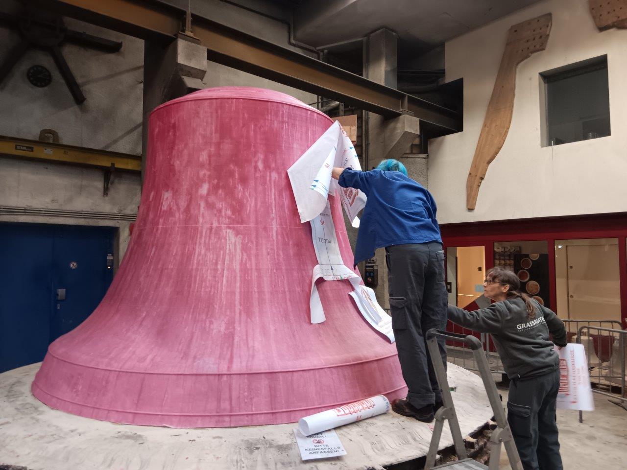 Am Tag der Vertrags-Präsentation war der Glockenkern als Formteil so gut wie fertiggestellt und so konnten Gert und Edda Weber 14 Tage später schon ihre Glockenzier auf die Falsche Glocke aufbringen. Dabei erfuhren sie große Unterstützung durch die Bildhauerinnen der Glockengießerei. Inzwischen sind schon etliche der bis zu 12 Zierlehmschichten auf die Wachsapplikationen aufgetragen und die Decklehmschichten werden aufgebracht. Bei der von der Gießerei Grassmayr angewandten Technologie des Sandgussverfahrens wird der Glockenmantel aus mit einem Bindemittel verfestigten Quarzsand in einem stählernen Formkasten hergestellt. Ist die Verfestigung ausreichend, wird, wie im traditionellen Lehmgussverfahren der Mantel abgehoben, die Falsche Glocke zerschlagen und der Glockenmantel, in dem das Negativ der Glockenzier und der Glockenkrone abgeformt ist, wieder aufgesetzt. Die gesamte Form aus Glockenkern, Hohlraum für die Bronze (bis dahin freigehalten durch die Falsche Glocke) und Glockenmantel wird in die Gussgrube gesetzt und eingegraben. Da in der Gießerei Grassmayr nicht von oben durch Gussrinnen, sondern steigend von unten gegossen wird, müssen noch diese Zuführungen für die flüssige Bronze in Form und Grube eingebaut werden.